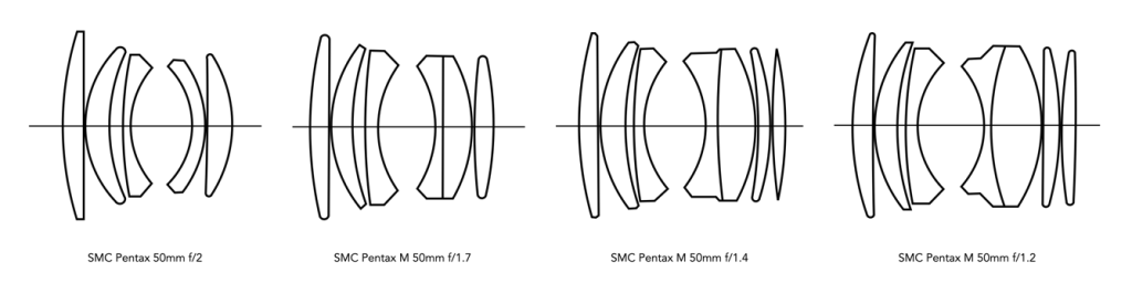 50년대와 60년대의 초고속 표준렌즈 개발사에서 당시의 Pentax (Takumar lens) 인기와 60대의 카메라/광학 업계의 위상에 견주어 볼 때, 펜탁스가 이 경쟁에 동참하지 않아서 의아했다. 초기(1952년)의 펜탁스 카메라는 M37 마운트, 1957년 이후에는 M42 마운트를 사용했다. 펜탁스의 성공으로 펜탁스 마운트라고도 불렸지만, M42의 내부구경이 작아서 초고속 표준렌즈를 만드는데 어려움이 있었다. (M42 마운트는 42mm 나사산 규격이지만, 실제 활용할 수 있는 구경은 최대 37mm 정도였다. 더구나 미러박스 공간의 문제로 긴 후방 초점거리 문제가 있어서 초고속 렌즈 설계에 발목을 잡았다) 펜탁스가 1975년에 배요넷 마운트로 변경하고서야 비로소 내부 지름/직경 42mm을 확보했고, K 마운트 출시와 동시에 기다렸다는 듯이 SMC Pentax 50mm f/1.2를 출시했다. (펜탁스의 50mm f/1.2 설계는 이후 니콘과 캐논의 50mm f/1.2 설계에 영감을 준 그리고 50미리 초고속 렌즈의 기준이 된 설계라고 생각한다. 아사히 광학의 타쿠마와 펜탁스의 광학 설계는 군더더기 없고, 광학 성능도 우수해서 개인적으로 좋아한다)