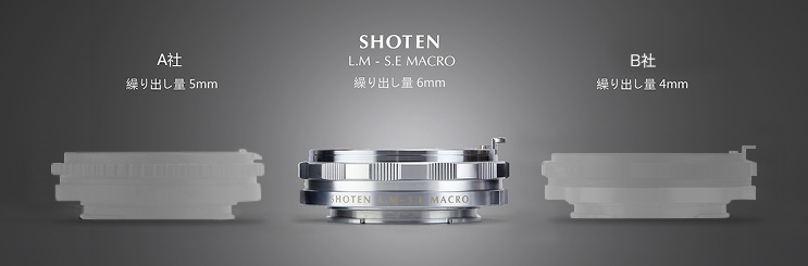 '쇼텐'은 일본의 카메라 악세사리 유통 업체인 'Shotenkobo-초점공방-'의 자사 브랜드로 다양한 카메라 마운트(Canon RF, Nikon Z, L-mount 등)에 대응하는 자사 어댑터 제품을 선보이고 있다. 2015년 초 Shoten L.M - S.E Macro를 출시했다. 아래 이미지 내용처럼 헬리코이드 확장 6mm로 (당시 제품 중 가장) 길었고, 황동과 알루미늄 주 소재로 어댑터 중량은 약 95g이다. E- mount와 X-mount 대응 블랙과 실버 제품. 어댑터가 견고하고 만듦새가 좋다. 무한대 잠금장치는 없고, 출시 가격 ¥ 24,800이었다.