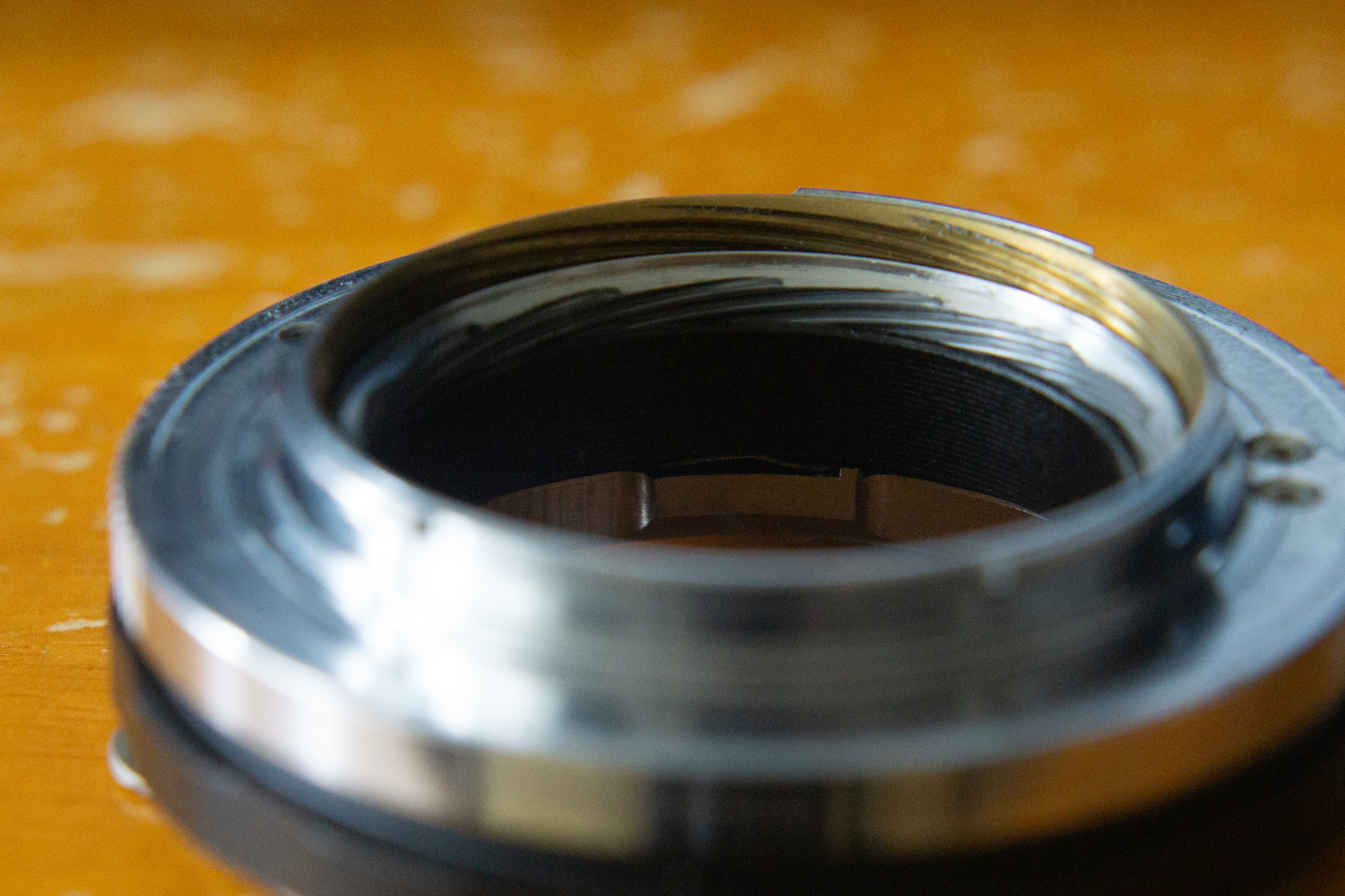 헬리코이드 확장 시 구조가 노출되는 어댑터는 카메라에 장착한 상태에서 헬리코이드 어댑터를 최대한 확장하면 아래 이미지와 같이 황동과 알루미늄 소재의 헬리코이드 구조가 쉽게 드러난다. 이 점에서는 나선 구조가 드러나지 않는 Shoten L.M - S.E Macro (L)의 마감이 좀 더 있어 보인다.