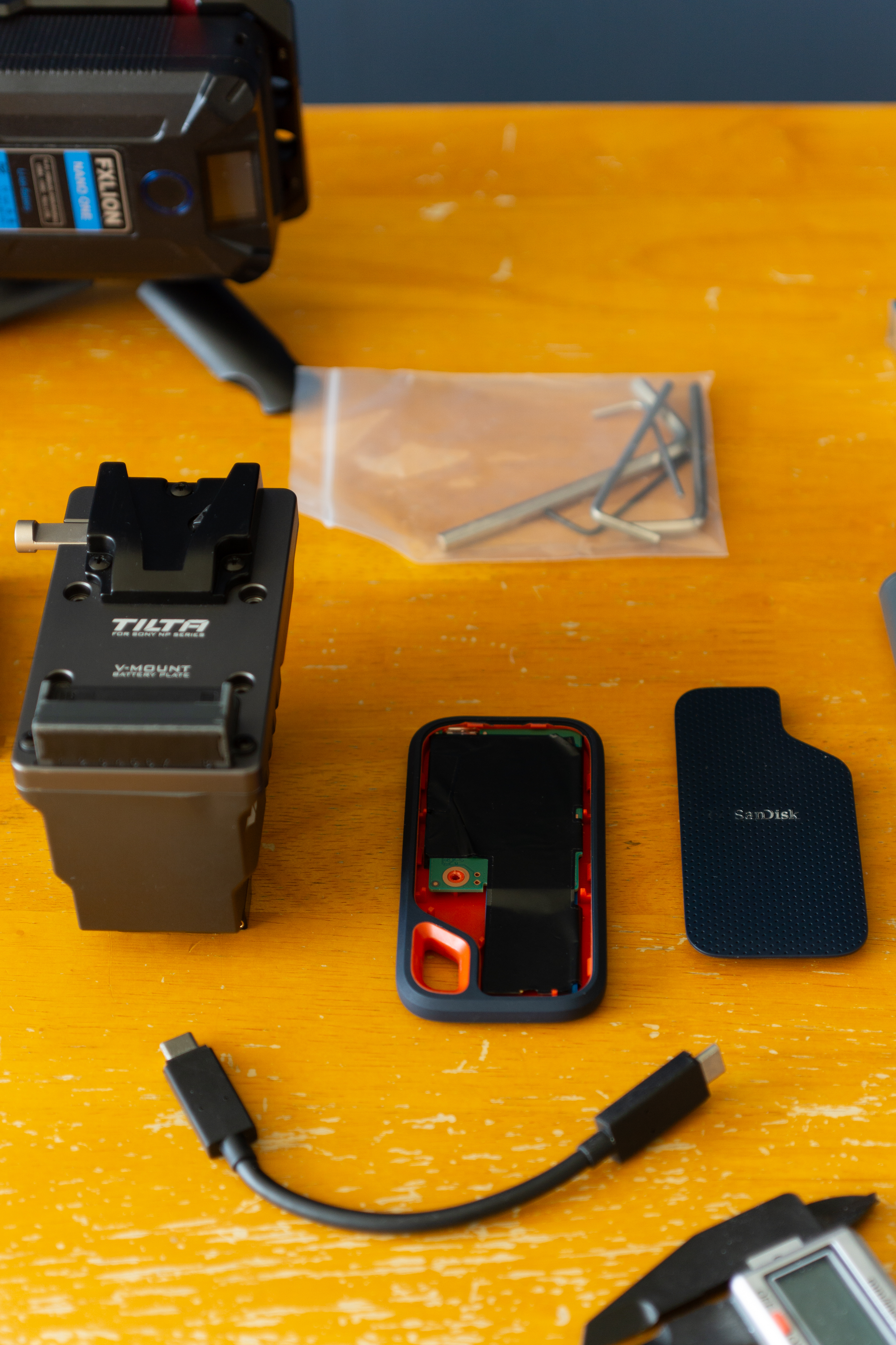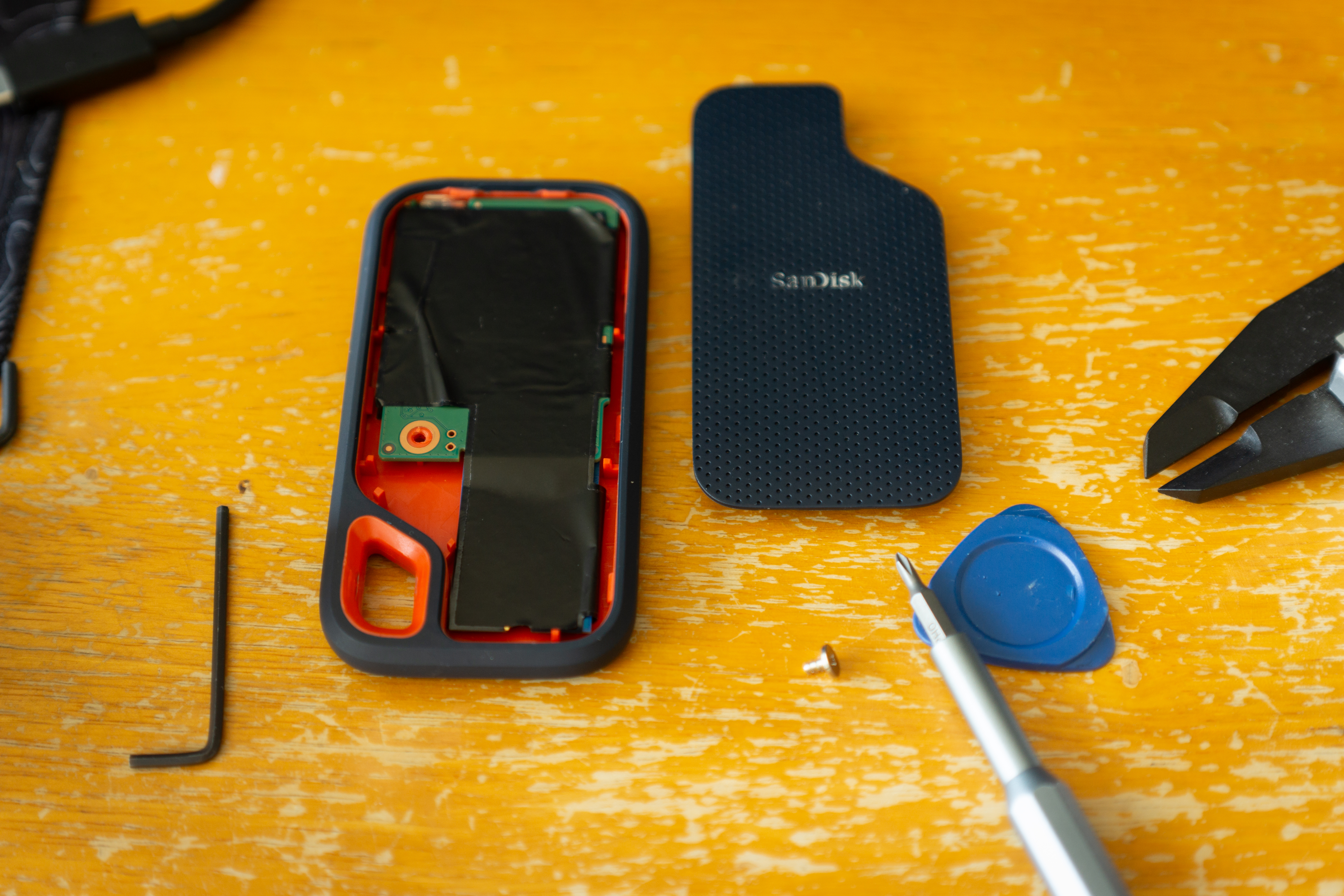 먼저, Tilta TA-ABP-G type 1의 내부 여유 공간을 감안해서, 작고 길쭉한 형태의 Sandisk Extreme Portable SSD가 크기면에서 적절해 보인다. 소형 전자기기 분해용 헤라를 이용해서 SSD의 뚜껑을 따고 고정용 나사 하나를 풀면 쉽게 분해된다.