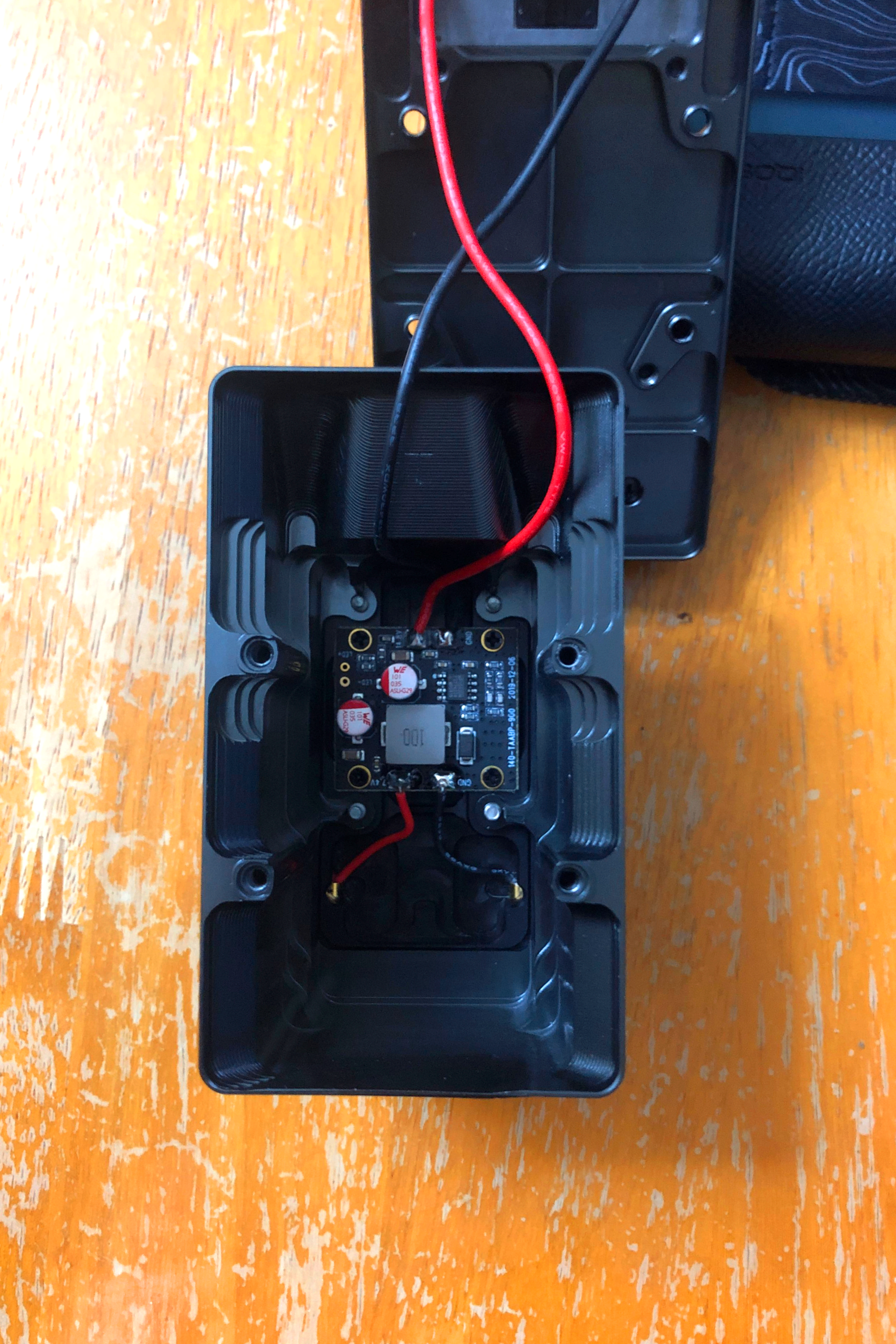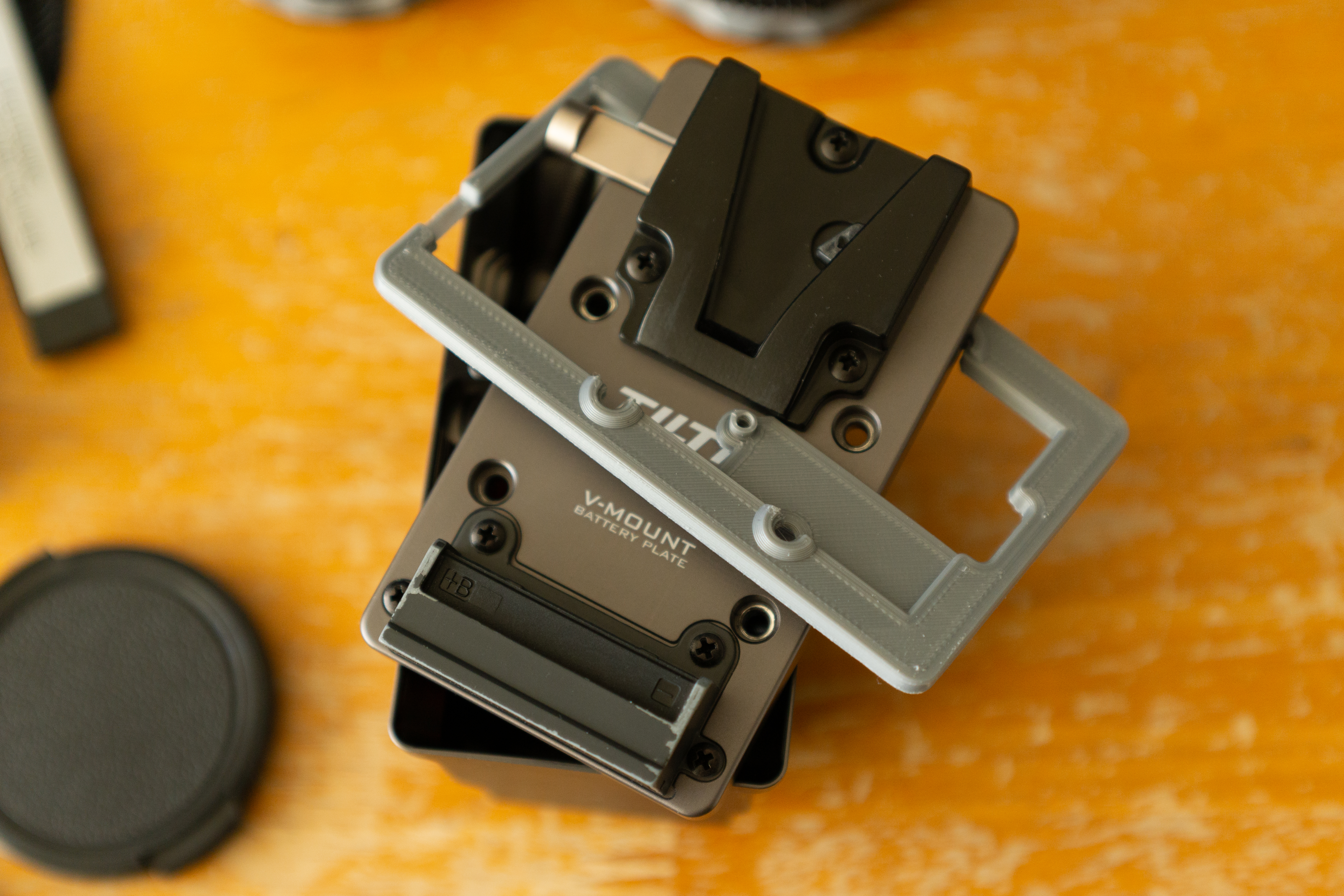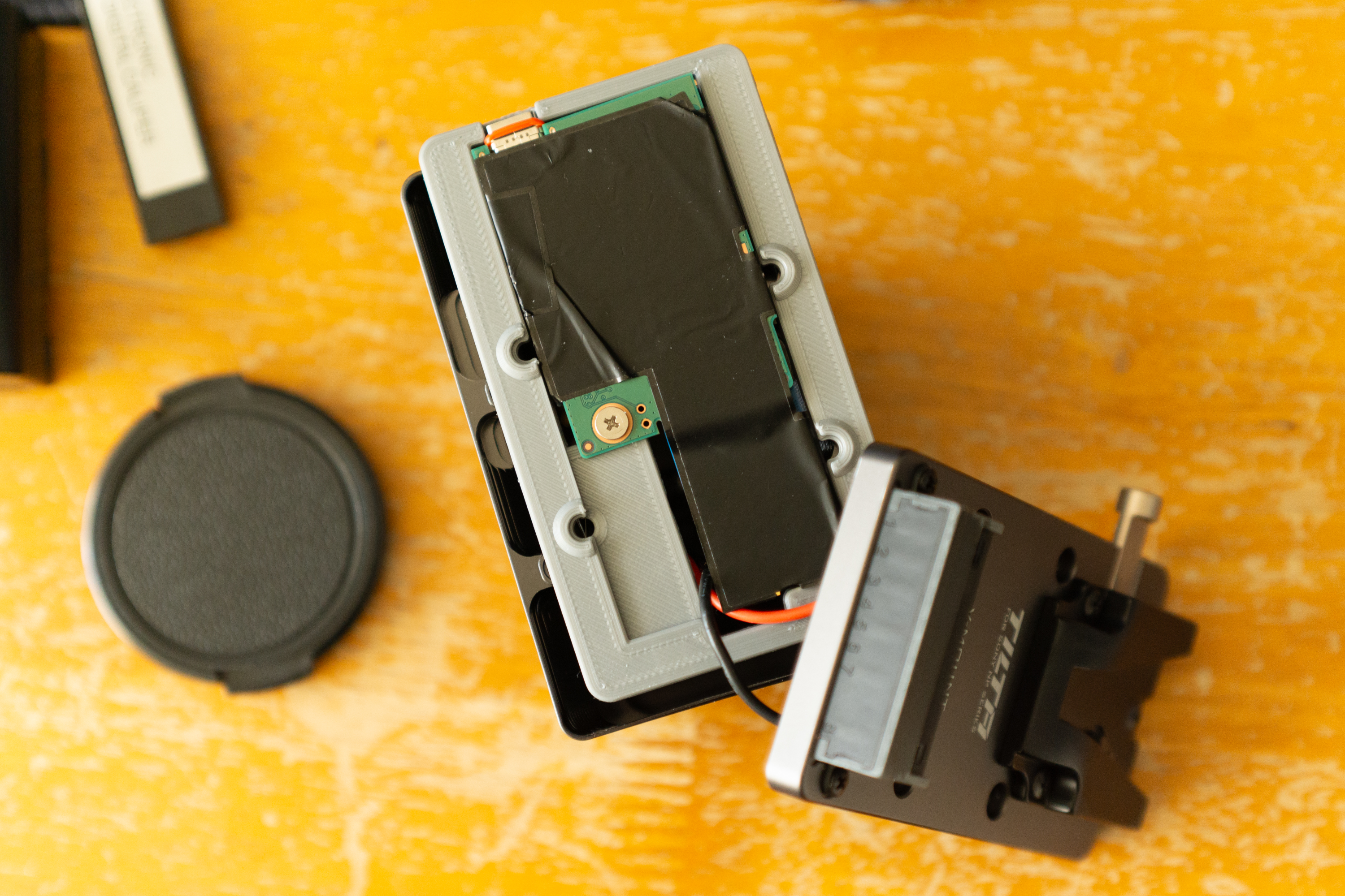 Tilta TA-ABP-G type 1의 V 마운트 장착 면의 나사(M3 x 8mm) 4개를 분리하고, 출력물을 위 가운데 이미지와 같이 먼저 끼운 후에 SSD를 결합하고, 내부의 전선은 하단부 구멍으로 정리 후 (SSD 분해 과정에서 분리한 나사를 이용해 고정) 재 조립한다. 내부에 추가된 부분 탓에 V 마운트 배터리 장착면은 Tilta TA-ABP-G type 1의 나사(M3 x 8mm) 4개로는 고정이 되지 않는다. 고정을 위해서 나사(M3 x 12mm) 4개가 필요하다.