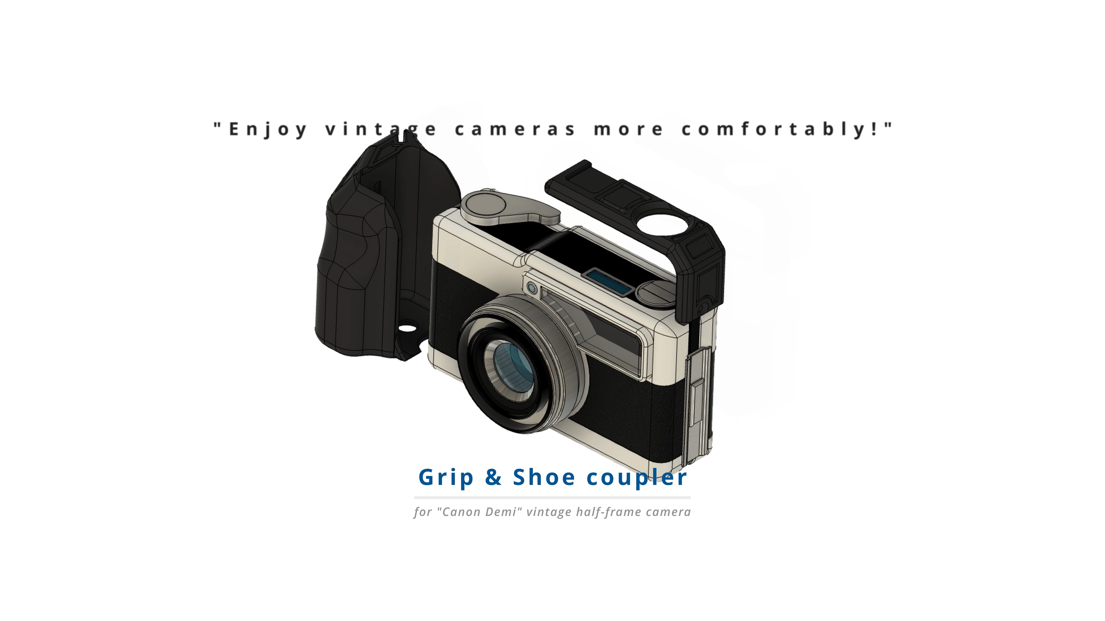 빈티지 필름 카메라 사용을 더 편리하게 할 수 있는 방법에 대해서 고민했고, 몇몇 도움이 되는 악세사리를 제작해서 불편함을 일부나마 해소할 수 있으리라 기대했습니다. 캐논 데미 하프 프레임 카메라 악세사리(그립과 슈 커플러) 디자인에서 주요 고려한 사항은 먼저, 안정적인 촬영을 위한 빈티지 카메라 그립과 액세서리 확장을 위한 필름 카메라 슈 커플러입니다. 이에 빈티지 감성을 더하는 그립과 슈 커플러와 편안한 그립감과 확장성을 동시에! 빈티지 카메라 액세서리 디자인과 모델링에 집중했습니다.
