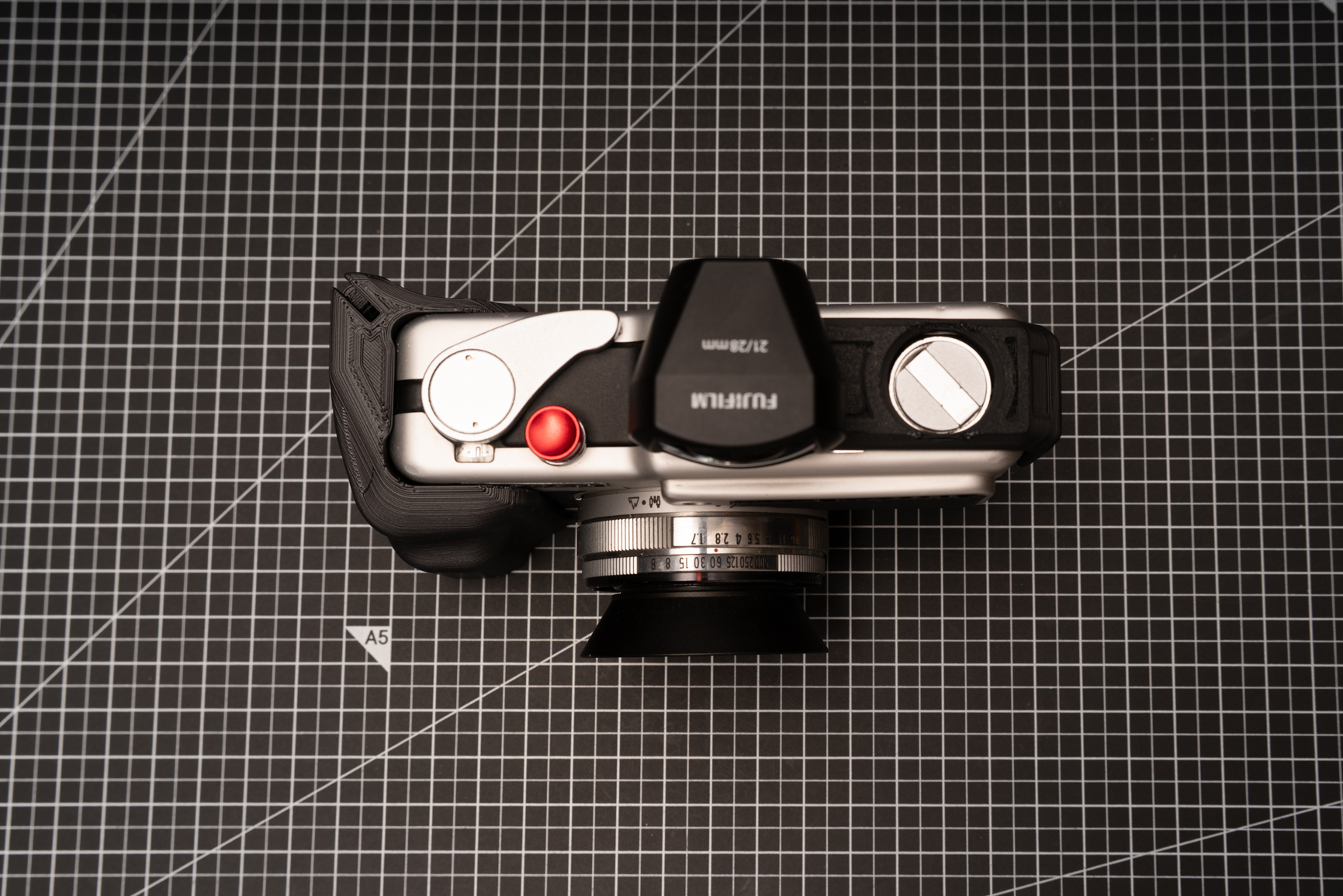 그립은 카메라 전면, 후면 일부, 우측면을 감싸는 형태로 설계되었으며, 상단과 좌측면은 개방되어 있습니다. 하단에는 1/4인치 카메라용 나사를 사용하여 카메라에 고정할 수 있습니다. 필름 장착 또는 교체를 위해 후면을 개방할 때는 매번 그립을 카메라에서 분리해야 합니다.