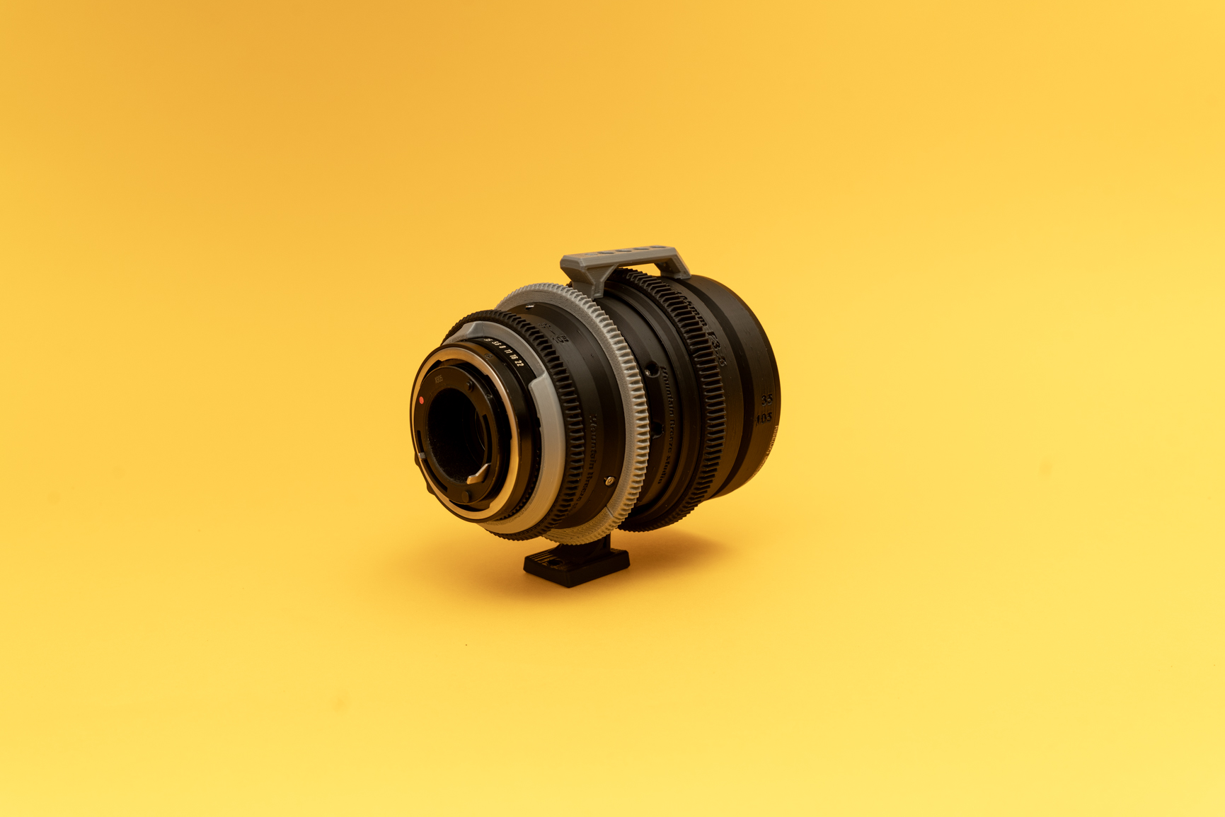 86~82mm 스텝 다운 링 + 전면 A 부품, 포커스 베이스 부품, 전면 B 부품을 렌즈 후면에서 전면으로 순차적으로 조립하세요. 이때 렌즈의 초점링을 무한대에 놓고, 이를 전면-A부분과 전면-B부분의 측면 기준선, 초점 베이스의 무한대 표시, 그리고 캐논 FD 35-105mm 렌즈의 마운트 위치(빨간색 점)에 맞춥니다.