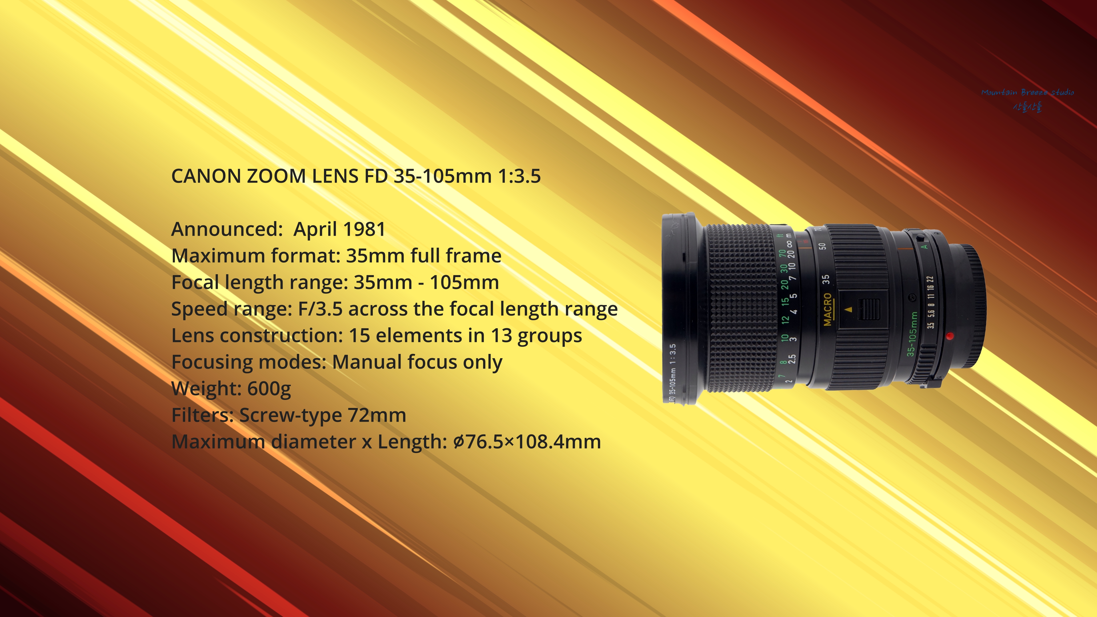 캐논 줌 렌즈 FD 35-105mm f/3.5는 캐논의 빈티지 FD 마운트 렌즈 중 하나로, 1981년에 출시된 표준 줌 렌즈입니다. 당시로서는 고정 조리개(f/3.5)를 가진 준수한 성능의 줌 렌즈로 평가받았습니다. 캐논 줌 렌즈 FD 35-105mm f/3.5는 캐논 FD 시스템을 사용하는 필름 카메라 사용자나 미러리스 카메라에 어댑터를 사용하여 빈티지 렌즈의 감성을 느끼고 싶은 사용자에게 좋은 선택이 될 수 있는 렌즈입니다. 특히 고정 조리개와 견고한 만듦새, 그리고 적절한 가격은 이 렌즈의 큰 매력이라고 할 수 있습니다. 다만, 긴 최소 초점 거리와 현대 렌즈 대비 떨어지는 주변부 화질은 고려해야 할 부분입니다.